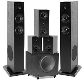 Полочники F300R могут быть успользованы не только для озвучки тыловых каналов, но и как самостоятельная стереопара — сил и умения ей не занимать — эти малыши (32.4×18×21.6 см) обладают достаточно глубокими басами (нижний порог частотного диапазона — 60Гц) и 100Вт мощностью. Двухполосная акустика может быть не только установлена на стойки, но и на полку (стоит правда оговориться, что порт фазоинвертера выведен назад), и несёт 5.25” полиграфитный СЧ-динамик и 1” тканевый высокочастотник. Аналогичные динамики использованы и в других моделях линейки: пара СЧ-головок и твитер в 120Вт центральном канале F300C; трехполосные напольные АС F300T кроме указанной троицы на боковых панелях имеют 8” низкочастотники, диффузор которых выполнен из прессованной бумаги. Низы отданы на откуп 10” активному сабу SF10, он способен «нырнуть» до 30Гц. Сердцем низкочастотника является встроенный усилитель на 100Вт RMS.