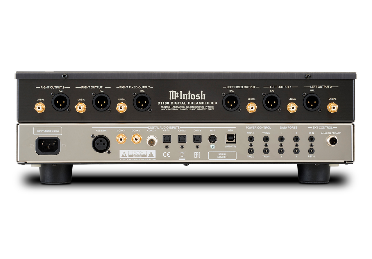 McIntosh D1100 не является предварительным усилителем в классическом понимании. Это цифровой пред и цифро-аналоговый преобразователь в одном корпусе. ЦАП построен по технологии QUAD Balance, по четыре 32-битных чипа на канал. D1100 имеет девять(!) назначаемых цифровых входов, от привычных оптического, коаксиального и USB до более экзотических MCT и AES/EBU. Иными словами, он сможет стать центром цифровой стереосистемы, ибо ему по плечу практически любая задача. Не под силу ему, быть может, лишь расшифровка аудиозаписей в текст. По USB можно принять PCM-сигнал с максимальным разрешением до 32-bit/384kHz и Direct Stream Digital DSD64, DSD128, DSD256, DXD 352.8kHz и DXD 384kHz. Остальные входы поддерживают максимум 24-bit/192kHz. Выходов тоже целая россыпь, но при этом лишь часть из них регулируемая.